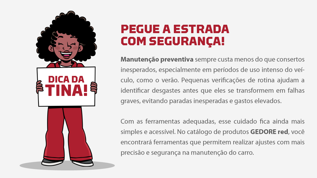No verão, vibrações constantes, longos trajetos e o calor excessivo podem afrouxar parafusos e comprometer a fixação de componentes do carro. Por isso, realizar inspeções periódicas e pequenos reapertos é uma atitude simples que ajuda a evitar ruídos, falhas mecânicas e até problemas de segurança. Com ferramentas profissionais da GEDORE red, esses ajustes se tornam rápidos, precisos e seguros, reforçando a importância da manutenção preventiva no dia a dia.